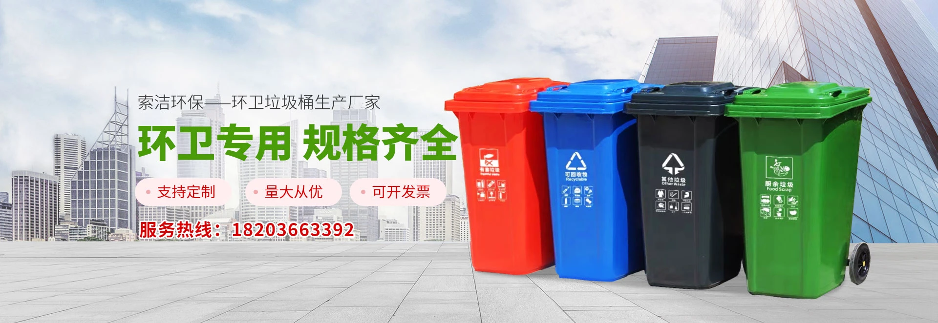 河南索洁环保设备有限公司是一家专业从事研发、生产、销售各类环保产品、塑料制品的企业。公司位于河南省郑州市,交通便利,地理位置优越。公司积极响应国家建设生态宜居城市、建设美丽乡村的要求,以推广环保理念为己任,着力研发、生产各种类型的环卫产品,公司拥有现代化厂房,大型注塑机械和一大批专业的技术人员。能满足广大顾客的要求。欢迎各位来参观指导工作。 河南索洁环保有限公司秉承“诚信共赢、科技创新、质量取胜”为企业思想。以全新的管理模式,完善的技术,周到的服务,通过专业研发队伍+专业营销团队+专业售后服务团队,为顾客打造轻松愉快的合作环境。